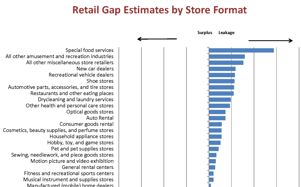 - A retail gap analysis also determined opportunities for business development by identifying business categories where resident spending power (demand) is greater than the number of trade area businesses (supply). Categories where demand is greater than supply can be seen in the blue bars in the graph below. These are possible opportunities for business development in Granite Falls.
